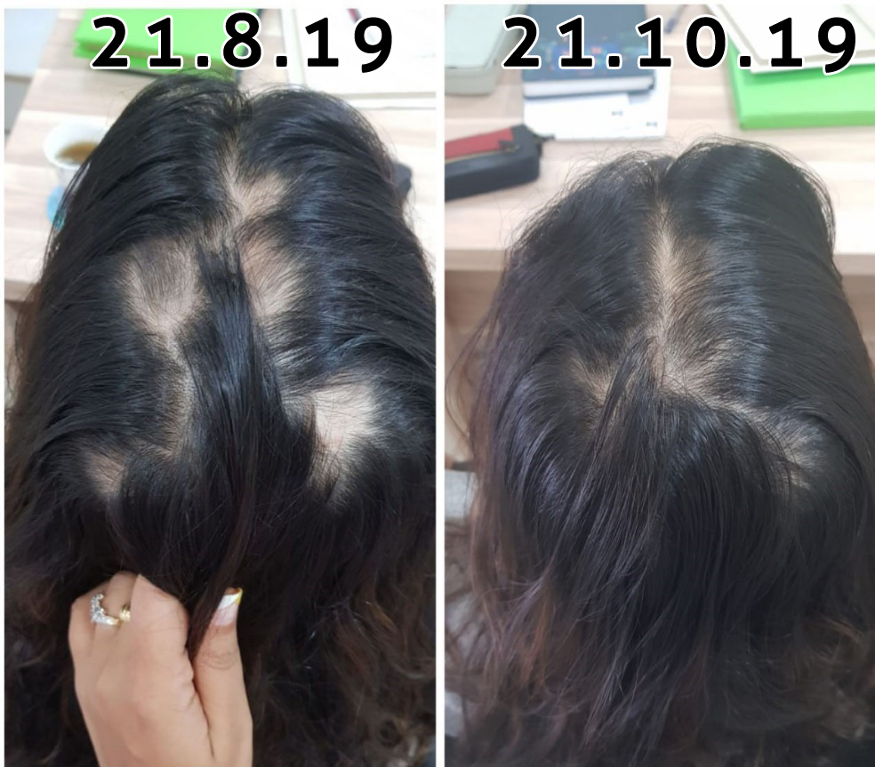 Seeing her sensitive personality, we prescribed Natrum Muriaticum to her on 21st august 2019. Within the matter of a couple of weeks her hair fall reduced and she started witnessing reduced hair fall even while combing her hair or on her hairband. We continued with the line of treatment and it continued to show positive results. In only 2 months we could see proper hair growth filling all the patches on her scalp and the symptoms being resolved.